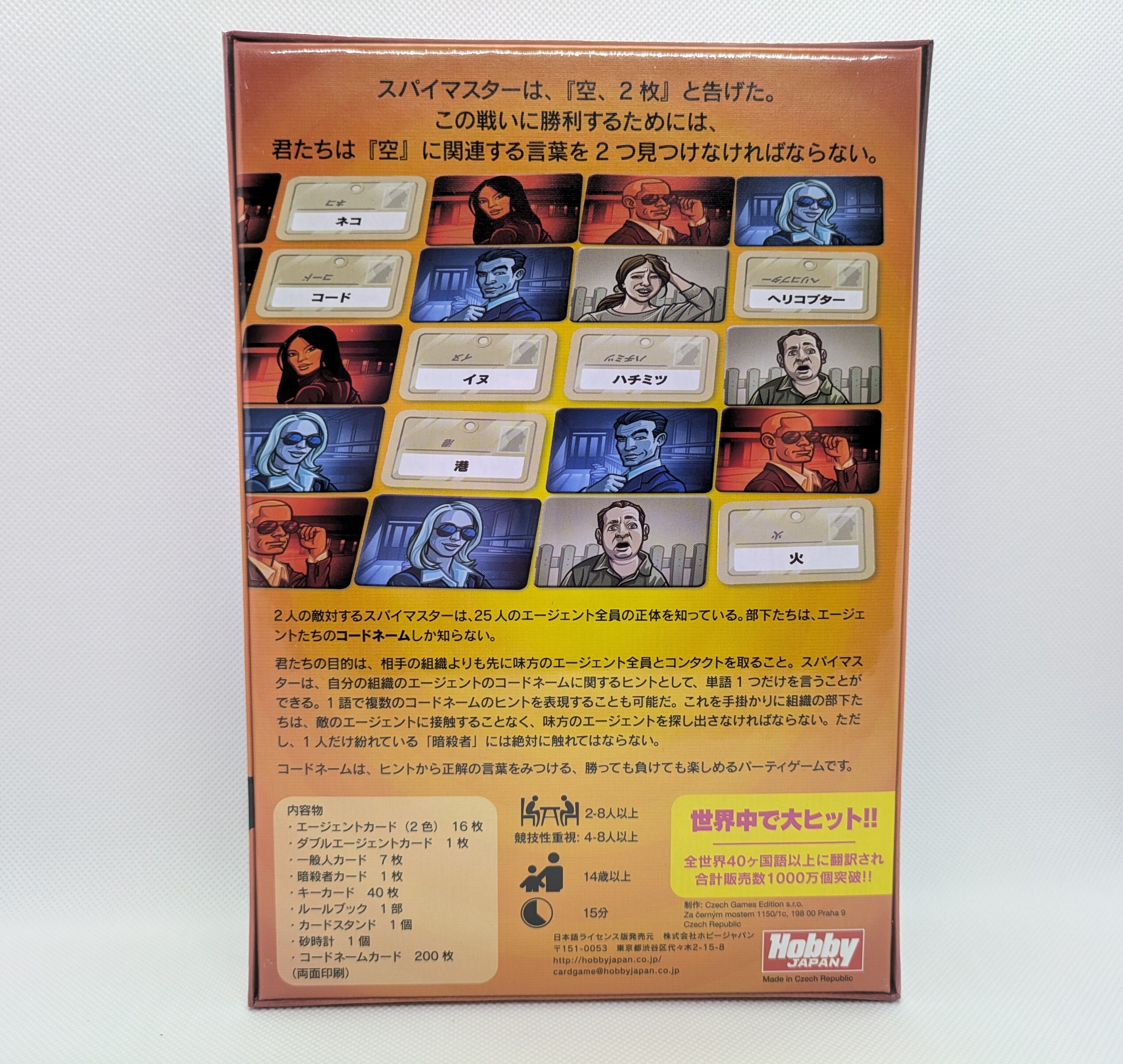 2つの敵対するスパイ組織がある。各組織のスパイマスターは、25人のエージェント全員の正体を知っている。君たち現場諜報員は、エージェントたちのコードネームしか知らない。君たちの目的は、相手の組織よりも先に味方のエージェント全員とコンタクトを取ること。